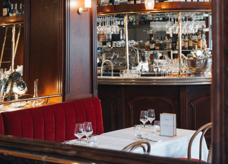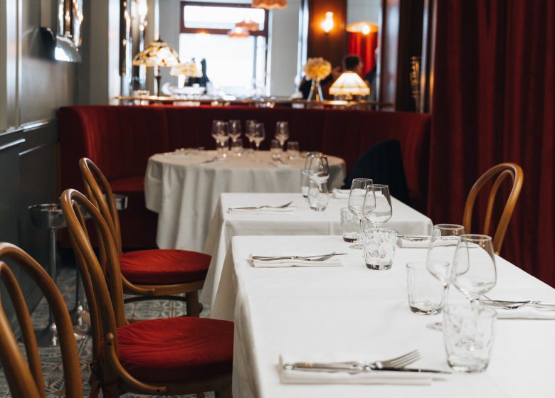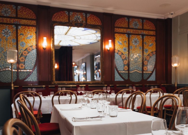 Met zijn “gezinswoning ” sfeer gedurende de dag, is de art nouveau-achtige eetkamer de plek voor lunch of diner, waar smakelijke, genereuze gerechten worden geserveerd met zeevruchten, slagerssneden en langzaam gekookte gerechten. U kunt ook genieten van een drankje rond het prachtig gepatineerde oude zink.